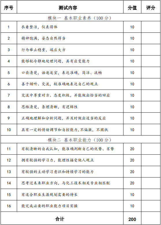 普通高中毕业生和高中同等学力人员职业适应性测试采取自我展示和问题回答相结合的方法,主要通过考生的自我介绍、回答问题等环节对学生的基本素养、学习能力及对化工技术类职业的认识来对考生的职业潜能进行整体的观察、考核与评价,满分值为 300 分。